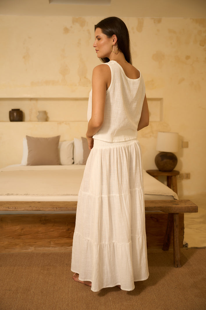 The BEA Long Skirt flows with understated grace. Made from 100% cotton, this full-length skirt features a wide smocked waistband that flatters the figure and soft, tiered layers that move beautifully with every step.