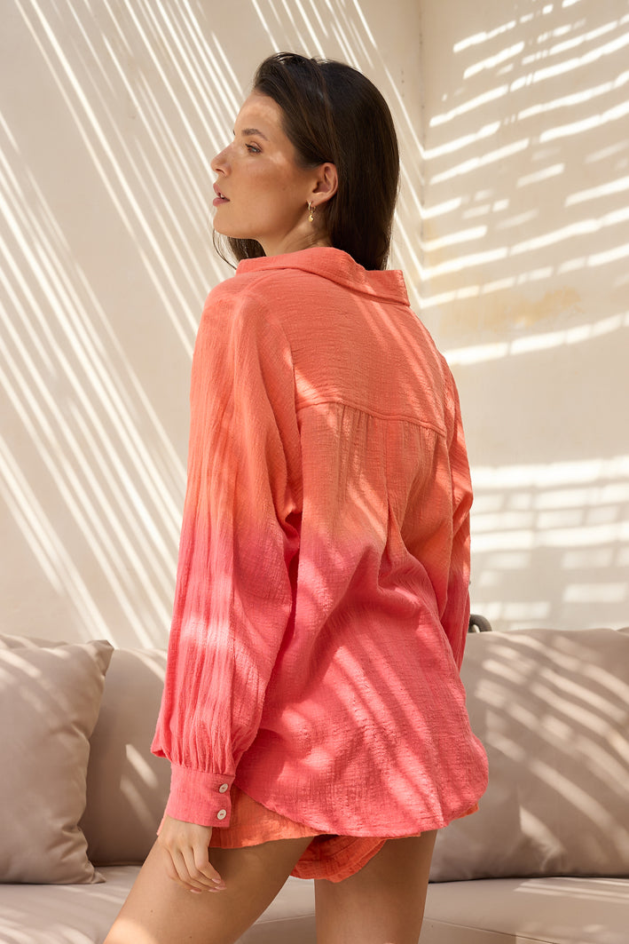 The Clane Blouse in Sunrise captures the perfect balance between relaxed elegance and artisanal craftsmanship. Made from 100% cotton, this lightweight shirt features a beautiful hand dip dyed gradient, blending warm coral into soft peach tones that evoke the first light of dawn.