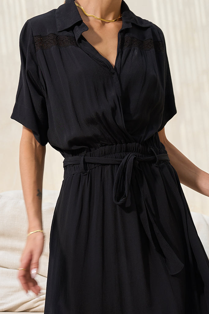 Tailored ease with a feminine flow. The Genevieve Midi Dress blends shirt-style structure with graceful movement, featuring a soft collar, short sleeves, and a tie waist for a customizable fit. Subtle lace detailing adds a touch of elegance, while the fluid fabric and midi length make it ideal for both everyday wear and elevated moments.