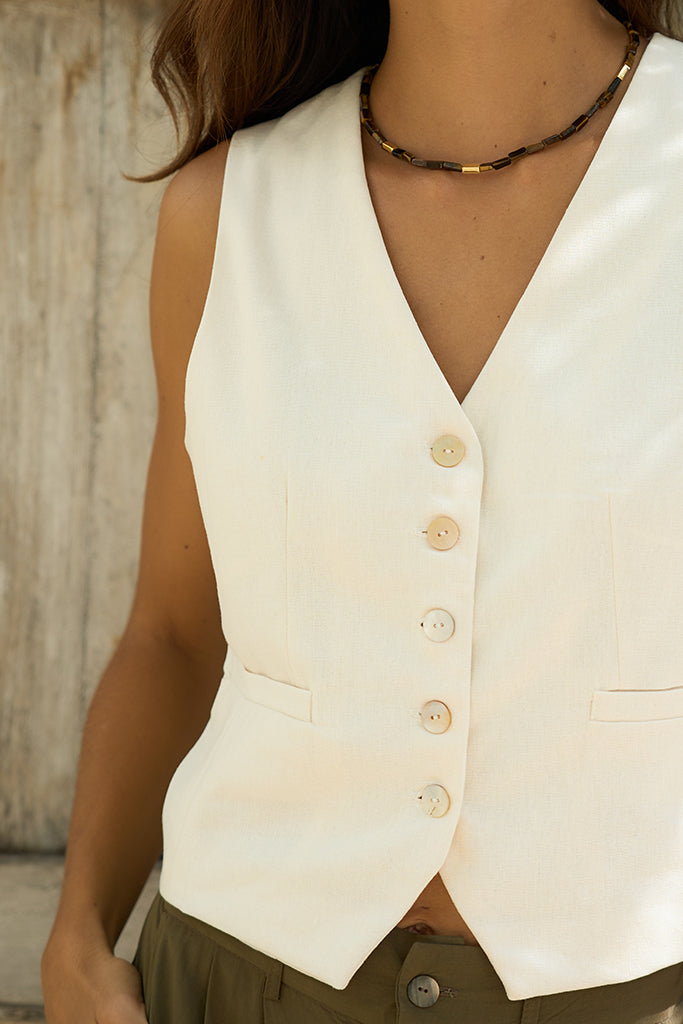 The Nina Vest is a timeless layering piece with modern island charm. Crafted in a breathable, textured cotton-linen blend, it features a flattering V-neckline, five-button front, and a clean sleeveless cut. Perfect for pairing with relaxed trousers, skirts, or shorts—this vest offers a structured look with a naturally effortless feel.