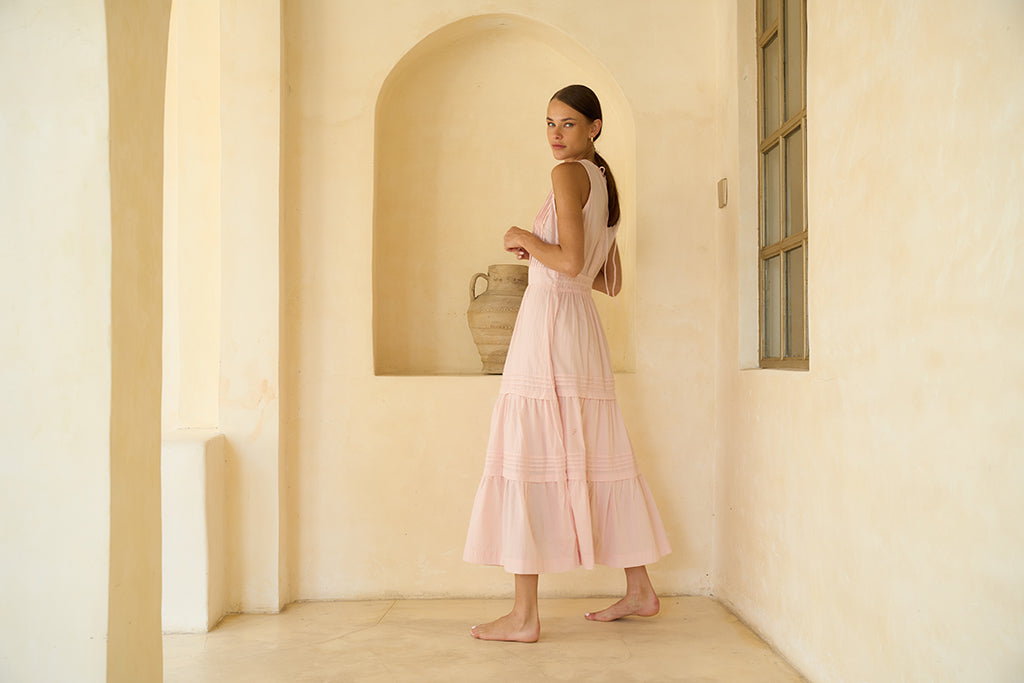 Romantic charm meets refined simplicity. The Perle Dress features a sleeveless bodice with delicate pintuck pleats and a softly gathered tiered skirt that flows with grace. Its soft blush hue and lightweight cotton create an airy silhouette, perfect for garden moments, weddings, or slow summer days.