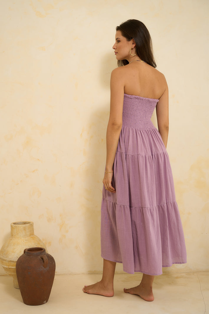 The Stella Midi Dress in Lilac is a timeless, feminine silhouette designed for effortless elegance. Crafted from soft, breathable 100% cotton, this strapless dress features a fully smocked bodice that offers a comfortable, flexible fit and a flowing tiered skirt that moves gracefully with every step. Perfect for sun-soaked days and balmy evenings, it combines comfort and beauty in equal measure.
