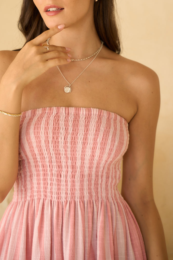 The STELLA Midi Dress in Rose Stripe embodies relaxed femininity and effortless grace. Made from 100% cotton, this strapless dress features a beautifully smocked bodice that flatters the silhouette while allowing for comfortable movement. The soft texture and airy feel make it perfect for sunlit days and balmy evenings alike.