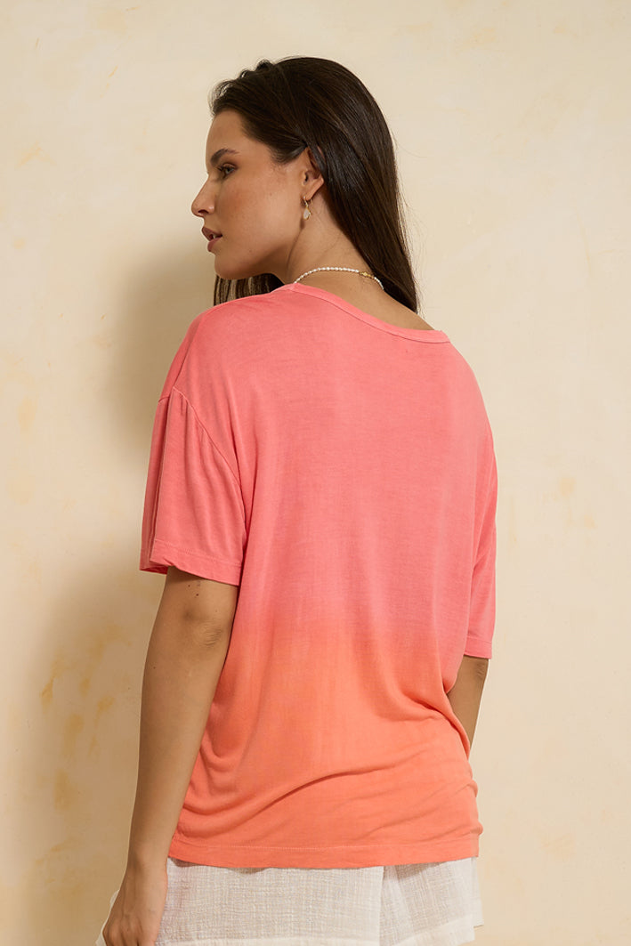The Authentic T-Shirt in Sunrise is your go-to piece for effortless comfort and style. Crafted from ultra-soft bamboo jersey, this relaxed tee offers a luxurious drape and a breathable feel against the skin. Its loose fit and rounded neckline make it ideal for easy everyday wear. Each piece is hand dip dyed, blending warm coral and soft peach hues that capture the magic of a tropical sunrise.