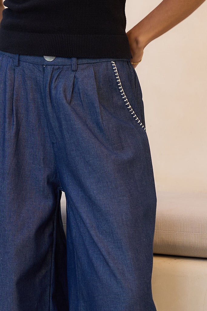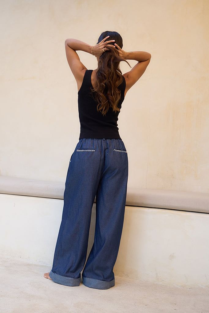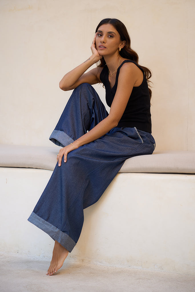 Laid-back, with a handcrafted touch. The Vittoria Long Pants feature a flattering wide-leg silhouette, soft denim feel, and hand-stitched natural string detailing at the front and back pockets. The elastic back waistband adds everyday comfort, while the rolled cuffs offer a playful, modern edge. Thoughtfully made by our artisans in Bali.